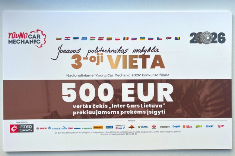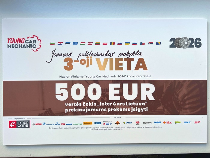 Vasario 26, 27 dienomis Vilniuje UAB „Inter Cars Lietuva“ vyko finalinis nacionalinio konkurso etapas, kuriame mokiniai buvo vertinami už įvairių gamintojų pateiktų užduočių atlikimą. Užduotis vertino garsių gamintojų atstovai, tokie kaip BOSCH, CONTI, ELRING, FEBI, FILTRON, MAYLE, NRF, SCHAEFFLER, SHELL, SKF, VARTA, ZF. Iš viso buvo 12 užduočių, kiekvienai skirta iki 45 minučių laiko, kurias atlikęs mūsų mokinys Adrianas Bagdonavičius užėmė 3 vietą. Už išskirtinius gebėjimus mokinys buvo įvertintas bei apdovanotas BOSCH, FEBI, VARTA prizais.