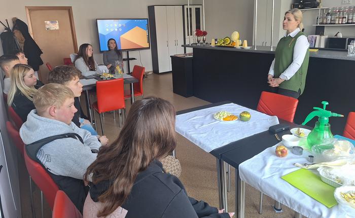 Vakar mūsų mokykloje lankėsi profesijos mokytoja Vita Brūzgienė iš Kauno maisto pramonės ir prekybos mokymo centro. Ji pasidalijo savo profesine patirtimi bei vedė įdomią ir naudingą edukaciją apie sūrių ir vaisių patiekimą.